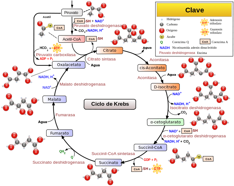 - Ciclo de reacciones: El acetil-CoA se une al ciclo de Krebs para iniciar una serie de reacciones químicas que incluyen la oxidación del α-cetoglutarato y la formación de succinato. Estas reacciones liberan CO2, producen NADH y FADH2, y regeneran oxalacetato.